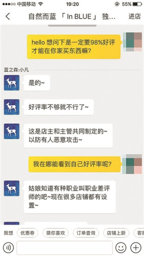 一家名為“自然而藍(lán)”的店鋪主營(yíng)服裝類商品,北青報(bào)記者以顧客身份進(jìn)行詢問,客服稱,買家發(fā)出的好評(píng)率要在98%以上,才可以在店中購(gòu)買。“好評(píng)率不夠就不行了,這也是店主和主管共同制定的,以防有人惡意攻擊!笨头藛T稱,目前有很多家店鋪都有類似設(shè)置,“因?yàn)橛蟹N行當(dāng)叫職業(yè)差評(píng)師,所以很多家店鋪都會(huì)設(shè)置,只是標(biāo)準(zhǔn)不一樣,算是不成文的規(guī)矩!