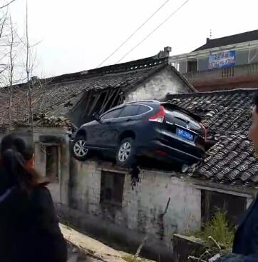 3月10日中午,江蘇泰興,一間近3米高的平房上,有一輛黑色本田SUV落在屋頂,壓塌了一大片瓦,車(chē)剛好“騎”在墻上,穩(wěn)穩(wěn)當(dāng)當(dāng)。車(chē)窗里,穿格子襯衫的男司機(jī)看著一圈圍觀的路人,一臉懵。約半小時(shí)后,司機(jī)終于被救出來(lái)。但圍觀人群還是納悶:他是怎么 “飛”上去的?