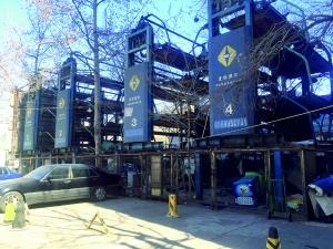 日前,記者來到工體南路小區(qū),劉先生所說的立體車庫就在工體南路小區(qū)門口的停車場內(nèi)最東側(cè),四個(gè)高度超過十幾米的立體車庫并排擺放,共占地上百平方米。每個(gè)車庫上有8個(gè)停車坪,可供32輛汽車停放。但目前這些立體車庫均成“空架”,外殼、鋼管都銹跡斑駁,內(nèi)部零件和設(shè)備凌亂散落。最低一層和周圍的地面上堆滿冰柜、舊家具、酒瓶紙箱等雜物,別說停放車輛,連落腳都難。車庫旁邊的兩三個(gè)簡易房還住著人,自稱從事貨運(yùn)配送工作,對立體車庫的情況一無所知,“我們來的時(shí)候這兒就已經(jīng)是這樣了,好多年了”。