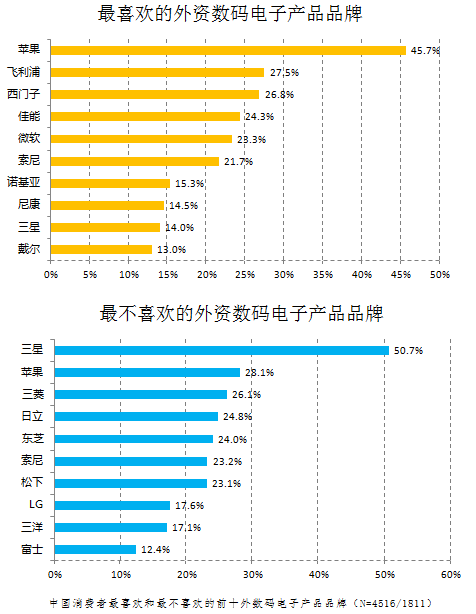 2017年的調(diào)查顯示,蘋果(Apple)是受訪者最愛的外資數(shù)碼電子產(chǎn)品品牌,提及率為45.7%;其他外資數(shù)碼電子品牌的受歡迎度與蘋果相比只能相形見絀。具體而言,飛利浦以27.5%的提及率排名第二位,排名第三位的是西門子(26.8%)。佳能與微軟排位第四五位,提及率分別為24.3%和23.3%。