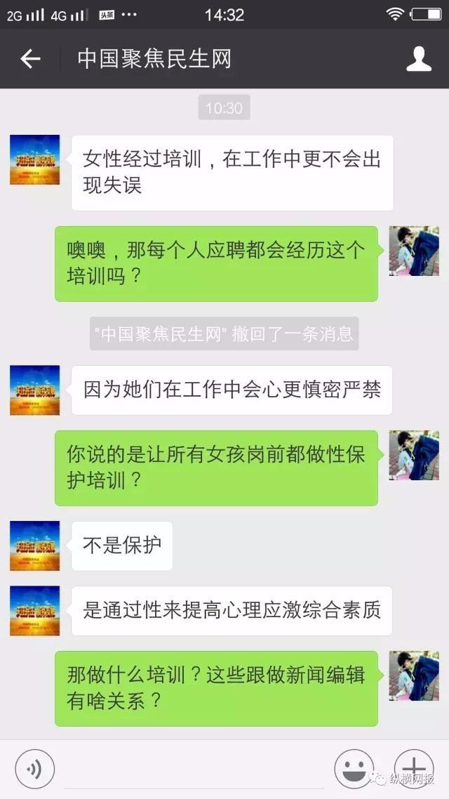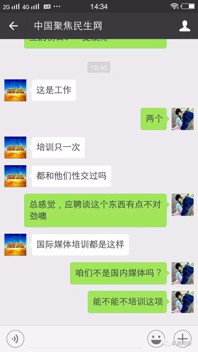 “《中國聚焦民生網(wǎng)》網(wǎng)站總監(jiān)周某某以招聘編輯為由,對應(yīng)聘女孩進(jìn)行性騷擾,且語言頗為露骨,還稱是國際綜合媒體領(lǐng)域頂尖技能培訓(xùn)……”