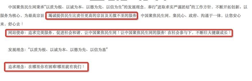 網(wǎng)站“追求完美服務(wù),促進(jìn)社會和諧,讓中國聚焦民生網(wǎng)!讓中國聚焦民生網(wǎng)的服務(wù)!在社會參與下,不斷壯大健康成長!”,以“在哪里你有困難!哪里就有我們”當(dāng)作網(wǎng)站的使命。