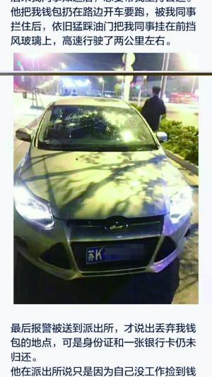 現(xiàn)代快報(bào)記者從小蓮提供的照片上看到,撿到錢(qián)包的男子駕駛的是一輛白色福特轎車。據(jù)介紹,對(duì)方意識(shí)到情況不對(duì)后,將錢(qián)包扔在路邊準(zhǔn)備駕車逃跑,“我同事就追他,抓住他轎車的雨刮器,當(dāng)時(shí)為了讓他停下來(lái),確實(shí)是砸了他擋風(fēng)玻璃的!毙∩彿Q,該男子被同事攔住后,“依舊猛踩油門(mén)把我同事掛在前擋風(fēng)玻璃上,高速行駛了兩公里左右。”