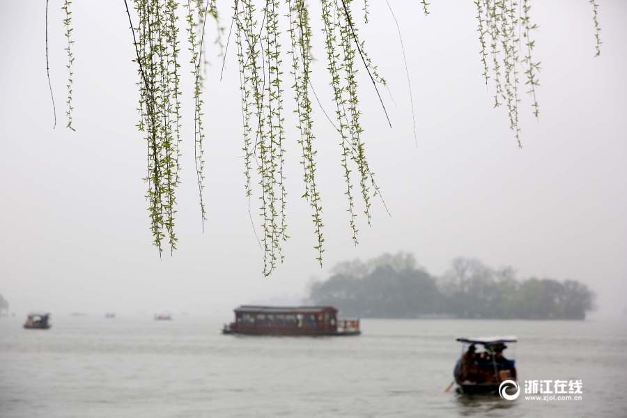 3月19日,杭城陰雨綿綿,西湖景區(qū)白堤兩岸桃紅柳綠,呈現(xiàn)出一幅“西湖美景三月天,桃紅柳綠又一春”的江南畫(huà)卷。(浙江在線記者 魏志陽(yáng) 攝)