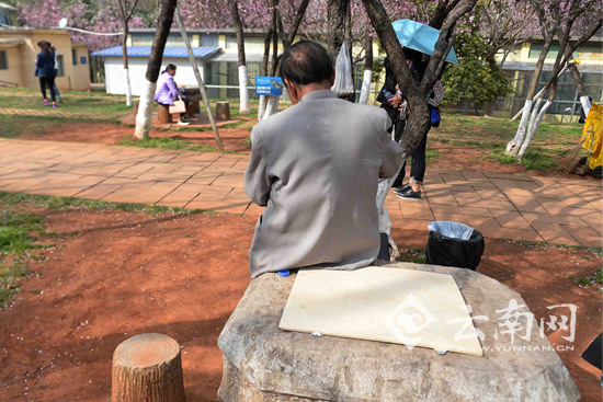 時(shí)值櫻花盛開,昆明動(dòng)物園游人如織。不過記者發(fā)現(xiàn),供游人休息的石桌石凳變成了麻將桌,有的還收費(fèi)。