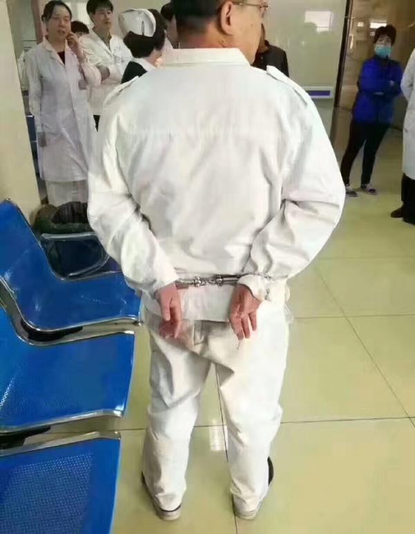 這名網(wǎng)友還附上了四張其所稱的“現(xiàn)場(chǎng)照片”,其中兩張照片中,一名身穿白色醫(yī)務(wù)人員工作服的男子雙手被手銬拷在身后。