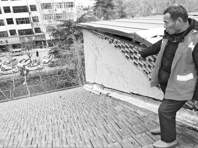 村民王根水爬到事發(fā)樓房房頂向記者還原當(dāng)時救人時的情形,張貴民的兒子張曉鶴曾在這里試圖用繩索救人。