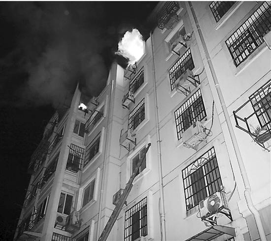 不到半分鐘,火勢(shì)猛烈燃燒,已蔓延到北面的小臥室。一名長(zhǎng)頭發(fā)姑娘也爬出了6樓窗臺(tái),她同樣緊緊攀在窗臺(tái)邊上。