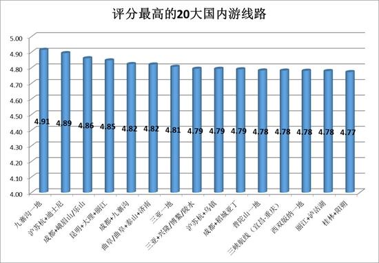 全國各地,哪些旅游線路的評分和滿意度最高?報(bào)告發(fā)布了“評分最高的20大國內(nèi)游線路”,九寨溝一地、滬蘇杭+迪士尼、成都+峨眉山樂山、昆明+大理+麗江、曲阜+泰山+濟(jì)南、三亞一地等排名在全國領(lǐng)先。優(yōu)質(zhì)線路主要來自四川、云南、江浙、兩廣、海南等地。這些線路點(diǎn)評分最低也達(dá)到4.79分,最高的超過4.9分。