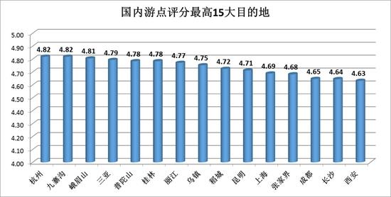 國內(nèi)眾多旅游城市和目的地中,哪些地方的游客點(diǎn)評分更高?報(bào)告發(fā)布了“國內(nèi)游點(diǎn)評分最高15大目的地”,依次是:杭州、九寨溝、峨眉山、三亞、普陀山、桂林、麗江、烏鎮(zhèn)、稻城、昆明、上海、張家界、成都、長沙、西安。其中,杭州以4.82分位居第1名。