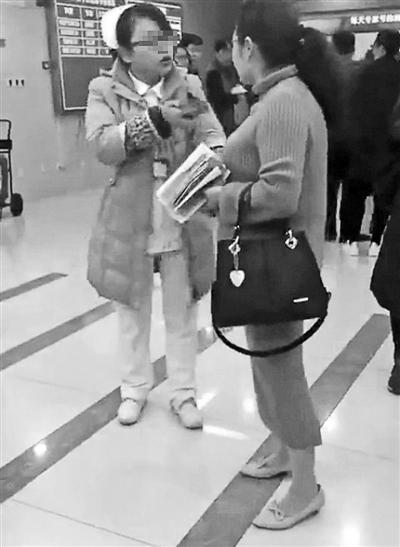 駱護士:我返回總臺工作大概20分鐘后,又有一個患者找到我說“你們醫(yī)院樓上有醫(yī)托”,當時我的火就上來了。這醫(yī)托就是在跟我們玩捉迷藏,我前腳剛走她又上來騙人,我氣的都語無倫次了。我到了二樓又看到那個穿綠色毛衣的醫(yī)托在掛號的窗口特別熱情地跟人搭訕,我上去就抓住了她,同時又給保安打了電話。后來就是視頻里的那些了,保安來了就把那人帶走了。