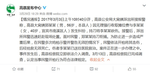 2017年3月3日上午10時(shí)40分許,高縣公安局大窩鎮(zhèn)派出所接報(bào)警稱,高縣大窩鎮(zhèn)鄭某某(男,56歲,本縣人)因無(wú)理強(qiáng)行收取攤位費(fèi)與李某某(女,40歲,宜賓市南溪區(qū)人)發(fā)生糾紛,持刀將李某某砍傷。