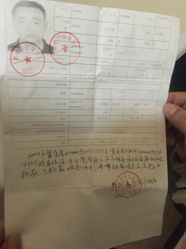 趙偉剛手中的證明是他的戶籍信息,下方寫有一行小字:“2004年冀魁星(41042619800713553x)冒用趙偉剛(410426197809165517)的身份證,在云南省麗江市永勝縣販賣毒品被抓獲,已槍斃,F(xiàn)趙偉剛涉嫌販毒信息正在更正中!