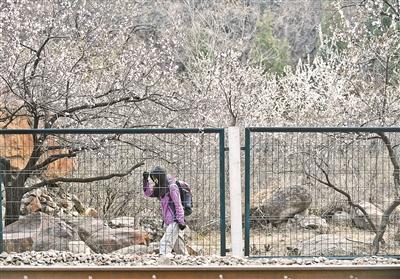 隨著北京入春,居庸關(guān)的山花也進(jìn)入了花期。昨日上午,北京青年報記者來到花海所處的鐵路路段——京包鐵路59公里至61公里之間。可以看到,山桃花已經(jīng)開放,而山杏花還未完全開放。但這并沒有阻擋攝影愛好者的熱情,向山上望去,不時有人從樹林中冒出頭,伸出攝影器材的“長槍短炮”。為了拍一張列車穿過花海的照片,很多游客甚至進(jìn)入鐵路軌道,這種行為每天都在上演。