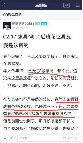 對于此次在貼吧發(fā)貼征男友,則是源于看到表姐在春節(jié)期間被逼婚的情景,因不想淪落到相同境地,故在貼吧發(fā)貼征一位“走心的、能長久的”男朋友。