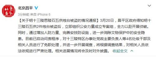 中新網(wǎng)4月5日電 關(guān)于明十三陵思陵石五供燭臺(tái)被盜案,北京市昌平區(qū)官方政務(wù)微博今日晚間發(fā)布消息稱,北京昌平區(qū)政府已成立專案組,全力以赴開展偵破,目前已啟動(dòng)問責(zé)程序,對(duì)十三陵特區(qū)辦事處黨政主要負(fù)責(zé)人等4名處級(jí)干部及相關(guān)人員進(jìn)行了免職處理。