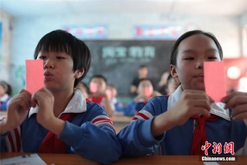 資料圖:“云端課堂”的普通話課上,學(xué)生們正用嘴對(duì)著紙片做爆破音練習(xí)。 馬義恒 攝