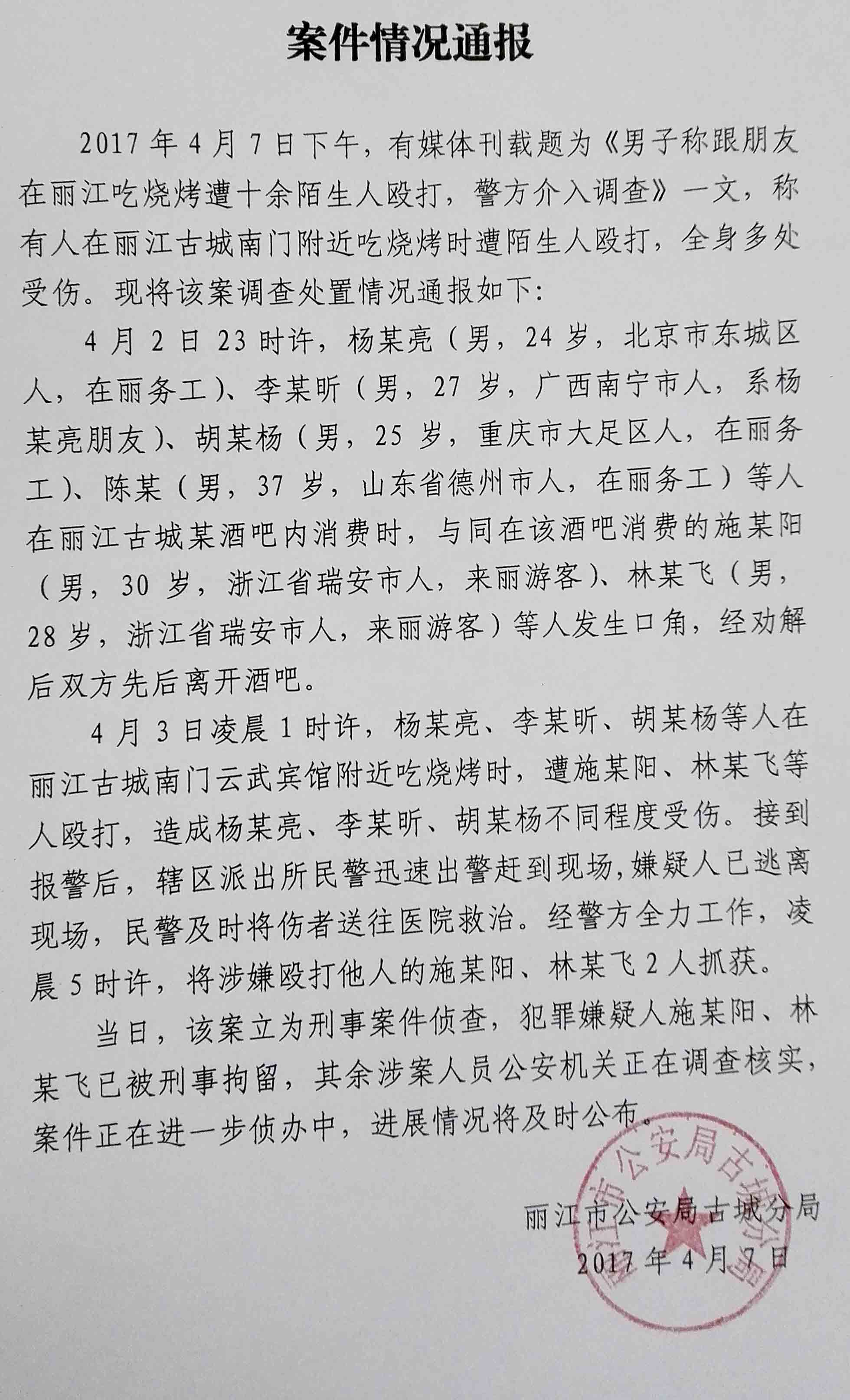 4月7日,有媒體報(bào)道一男子在麗江吃燒烤時(shí)被十余人毆打,造成全身多處受傷。下午,麗江市公安局古城分局就此案調(diào)查處置情況做出了通報(bào):