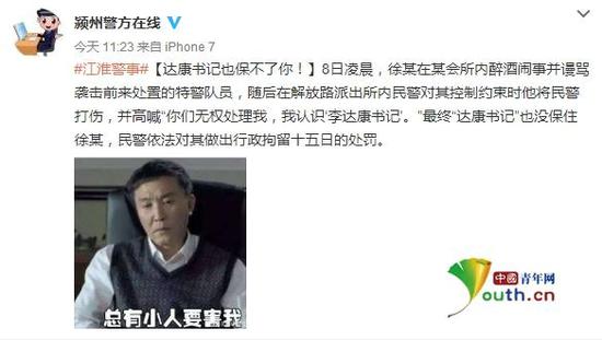 中國青年網(wǎng)北京4月10日電 據(jù)微博認(rèn)證為“安徽省阜陽市潁州公安分局”的賬號@潁州警方在線發(fā)布消息稱,8日凌晨,徐某在某會所內(nèi)醉酒鬧事并謾罵襲擊前來處置的特警隊員,隨后在解放路派出所內(nèi)民警對其控制約束時他將民警打傷,并高喊“你們無權(quán)處理我,我認(rèn)識‘李達(dá)康書記’!
