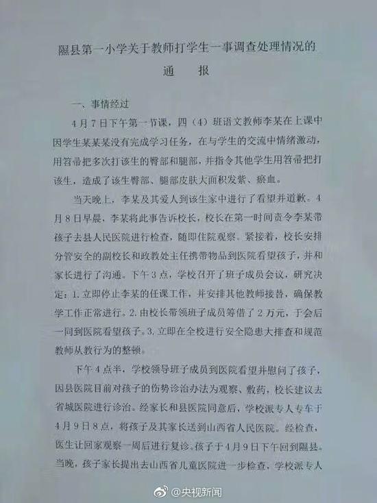 山西隰縣第一小學關于教師打學生一事調查處理情況的通報。 @央視新聞 圖