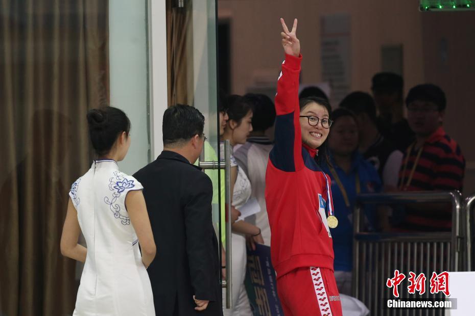 4月12日,傅園慧在頒獎儀式后向觀眾致意。當日,在山東青島進行的2017年全國游泳冠軍賽暨第十三屆全運會預選賽女子100米仰泳決賽中,浙江選手傅園慧以58秒72的成績奪冠,并打破由她自己創(chuàng)下的該項目全國紀錄。 中新社記者 韓海丹 攝