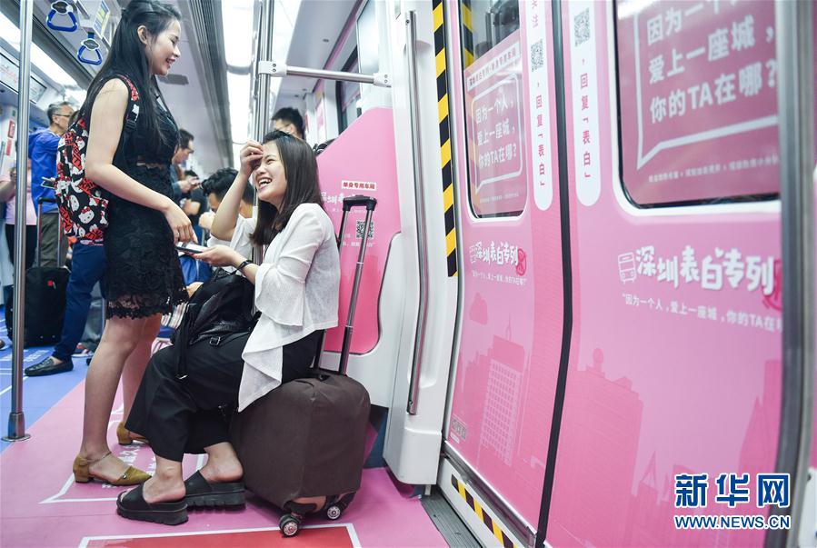 5月8日,乘客搭乘深圳地鐵“表白專列”。當日,廣東深圳地鐵“表白專列”正式運營。這趟列車將運行1個月,每天在地鐵1號線上巡回行駛。列車車廂被裝飾成粉色系,印上了從網(wǎng)友上千條投稿中精選的表白文字。新華社記者 毛思倩 攝