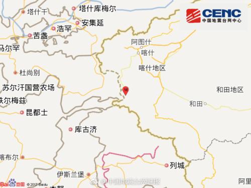 隨后,中國地震臺網又兩次發(fā)布消息,分別為:06時00分在新疆喀什地區(qū)塔什庫爾干縣(北緯37.62度,東經75.27度)發(fā)生4.5級地震,震源深度5千米;06時29分在新疆喀什地區(qū)塔什庫爾干縣(北緯37.63度,東經75.26度)發(fā)生3.0級地震,震源深度7千米。