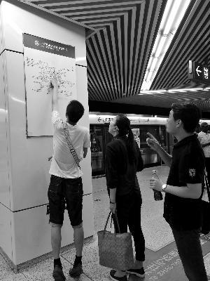 記者又走訪其他地鐵站,在海淀黃莊站看到,同樣的“北京城市軌道交通線網(wǎng)圖”被貼在了不銹鋼宣傳欄里,看起來正合適。