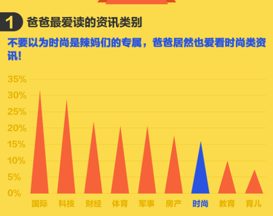 不要以為時(shí)尚是辣媽的專屬,爸爸也是愛(ài)看時(shí)尚類資訊的!16.5%的爸爸們?cè)陂喿x資訊時(shí)會(huì)選擇時(shí)尚類。
