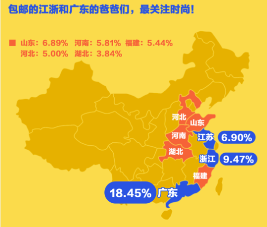 哪里的爸爸最關(guān)注時(shí)尚呢?UC數(shù)據(jù)顯示,來(lái)自廣東和包郵江浙的爸爸們遙遙領(lǐng)先,不知道是否是因?yàn)榉奖阗I買買?而生活在一線城市的爸爸們也更為關(guān)心時(shí)尚。