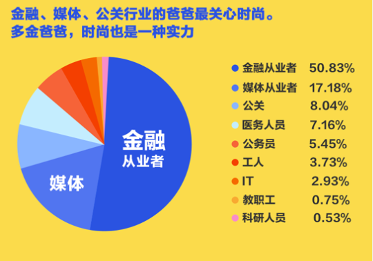 談到時(shí)尚爸爸的職業(yè)分布,數(shù)據(jù)統(tǒng)計(jì)表明來(lái)自金融、媒體、公關(guān)行業(yè)的爸爸最關(guān)心時(shí)尚,其中金融行業(yè)占據(jù)過(guò)半?磥(lái),對(duì)于多金爸爸來(lái)說(shuō),時(shí)尚也是一種實(shí)力。