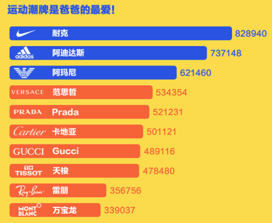 爸爸最青睞的時(shí)尚品牌方面里不乏阿瑪尼、范思哲、Prada這類奢侈品牌,不過(guò),排名最靠前的還屬耐克與阿迪達(dá)斯,看來(lái),運(yùn)動(dòng)潮牌才是爸爸的最愛(ài)。