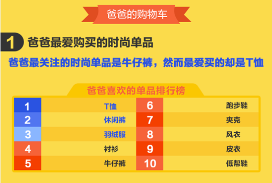 時(shí)尚爸爸們的購(gòu)物車?yán)镉謺?huì)是怎樣的情形呢?數(shù)據(jù)顯示,潮爸們最關(guān)注的時(shí)尚單品是牛仔褲,最愛(ài)買的卻是T恤,也許是因?yàn)榕W醒澖?jīng)穿,T恤則多多益善吧。