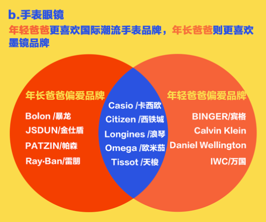 在手表眼鏡類中,年輕爸爸比年長(zhǎng)爸爸顯得更時(shí)髦,他們更喜歡近幾年風(fēng)靡的國(guó)際時(shí)尚品牌,例如DW、CK等,年長(zhǎng)爸爸則更偏向購(gòu)買墨鏡品牌。