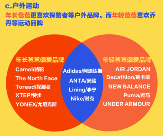 而在購(gòu)買戶外運(yùn)動(dòng)品牌時(shí),年輕與年長(zhǎng)爸爸們最愛(ài)的都是Nike、Adidas、李寧、安踏。但整體來(lái)看,年長(zhǎng)爸爸更喜歡探路者、駱駝、迪卡儂等,而年輕爸爸青睞選擇喬丹、Puma、UM等新興潮牌。