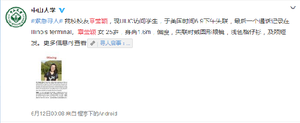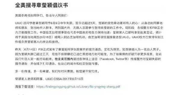 6月15日,伊利諾伊大學(xué)華人學(xué)生學(xué)者聯(lián)合會(huì)(UIUC CSSA)與章瑩穎家人、老師、同事聯(lián)合在各社交平臺(tái)上發(fā)布《全美搜尋章瑩穎倡議書(shū)》,號(hào)召大家在全美范圍內(nèi)擴(kuò)散警方對(duì)中國(guó)訪(fǎng)問(wèn)學(xué)者章瑩穎失蹤的搜尋通告。