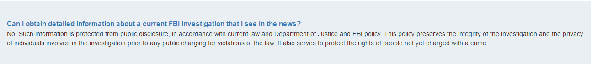 同時(shí),根據(jù)美國(guó)現(xiàn)行法律和司法部和聯(lián)邦調(diào)查局的政策,F(xiàn)BI參與調(diào)查的案件信息不受偵查公開(kāi)原則的影響。這項(xiàng)政策指在任何公開(kāi)指控違反法律的情況下,都保留了參與調(diào)查的個(gè)人的調(diào)查和隱私的完整性。