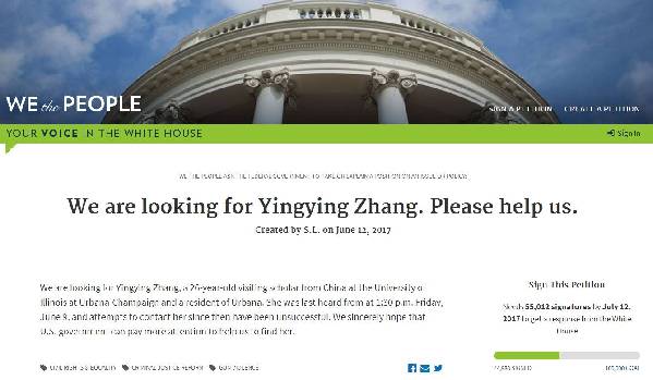 在美國(guó)白宮網(wǎng)站上,尋找章瑩穎的請(qǐng)?jiān)敢殉掷m(xù)數(shù)日。親友們希望通過(guò)白宮請(qǐng)?jiān)笖U(kuò)大事件影響,以敦促警方調(diào)查。但目前該請(qǐng)?jiān)赣?萬(wàn)余人簽署,仍遠(yuǎn)低于白宮公開(kāi)回應(yīng)的10萬(wàn)人標(biāo)準(zhǔn)。