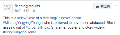 在Twitter、Facebook等社交網(wǎng)站上,轉(zhuǎn)發(fā)章瑩穎失蹤信息的主力是中國(guó)留學(xué)生和部分州的失蹤人口發(fā)布賬號(hào)。
