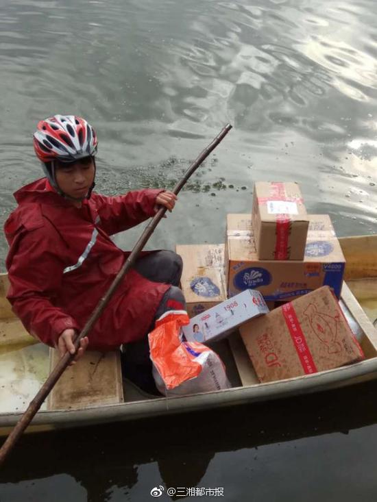 【暴雨襲湘 小哥劃船送快遞】入汛以來最強(qiáng)降雨過程持續(xù)“發(fā)力”,湖南多地受災(zāi)。在益陽,大雨已經(jīng)持續(xù)了3天以上,老城區(qū)煤電公司家屬安置區(qū)的門口,積水已有大腿深。快遞小哥鐘高租來漁民的小船,給住在安置區(qū)的老人送去快遞。不容易,送快遞也要自帶劃船技能。