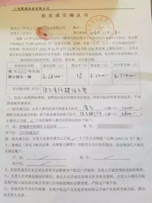 2016年11月8日,南寧盧先生參與防城區(qū)人民法院組織的一起司法拍賣,以7.14萬(wàn)元(成交價(jià)6.8萬(wàn)元,拍賣傭金3400元)的價(jià)格,競(jìng)拍到一輛黑色豐田牌皇冠轎車。