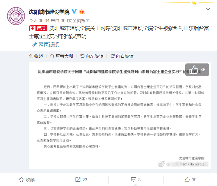 該聲明中寫道:近日,網(wǎng)絡(luò)媒體上出現(xiàn)了“沈陽城市建設(shè)學(xué)院強(qiáng)制要求學(xué)生暑期到富士康(煙臺(tái))科技工業(yè)園實(shí)習(xí),實(shí)習(xí)工廠環(huán)境差、工資低、管理混亂“的相關(guān)報(bào)道。我廳高度重視,立即調(diào)查相關(guān)情況,并作出相應(yīng)處理,F(xiàn)聲明如下: