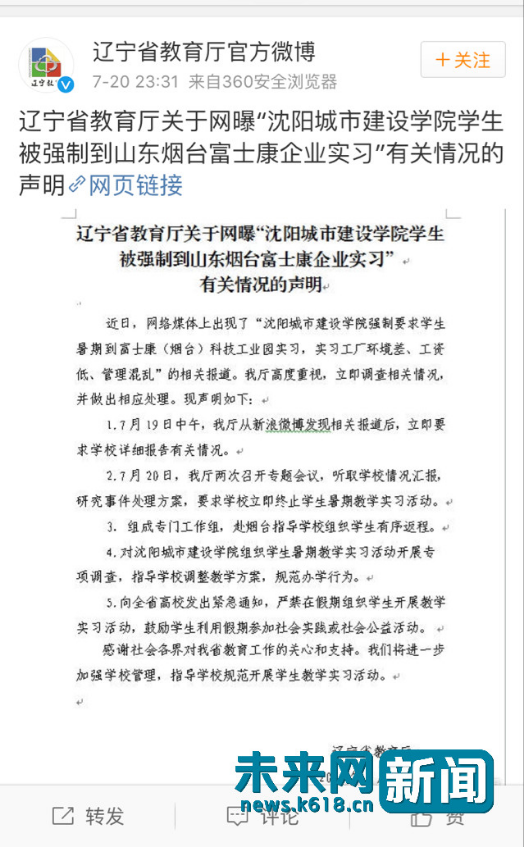 未來網(wǎng)北京7月21日電(記者 廖瑾)20日晚,遼寧省教育廳發(fā)布聲明,回應(yīng)“沈陽城市建設(shè)學(xué)院學(xué)生被強(qiáng)制到山東煙臺(tái)富士康企業(yè)實(shí)習(xí)”一事,要求學(xué)校立即終止學(xué)生暑期教學(xué)實(shí)習(xí)活動(dòng)。