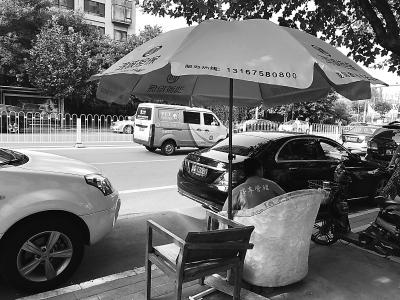 順著停車帶往東走,會看到身穿橙色制服的幾名男子騎著電動自行車來回巡視,每當(dāng)有車從停車位開走,或者準(zhǔn)備停車時,他們就會上前,從車的前擋風(fēng)玻璃取下小紙條,按上面的時間收錢。在這條路中段的人行道上,立著一把黃色的大傘,傘下面擺著兩把椅子,一名身穿淺藍色上衣的男子正在路邊喝水,所穿的衣服后背上印著“停車管理”四個字。他告訴記者:“這條路兩側(cè)路邊停車都是要收費的,第一個小時6元,第二個小時9元。”他說因同村的老鄉(xiāng)有事,所以臨時來替他上幾天班。他指了指頭頂?shù)恼陉杺阏f,這把傘和沙發(fā)都是路邊一家金融公司提供的。
