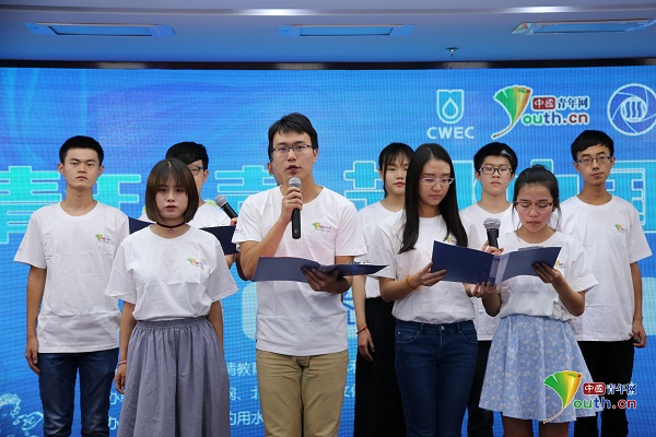 活動(dòng)現(xiàn)場,來自清華大學(xué)、北京郵電大學(xué)、北京航天航空大學(xué)、北京理工大學(xué)、中國石油大學(xué)、北京科技大學(xué)、北京交通大學(xué)等高校學(xué)生代表宣讀節(jié)水倡議書。中國青年網(wǎng)記者 張群攝