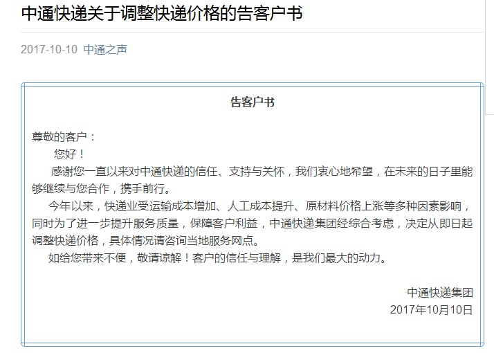 中通快遞表示,今年以來,快遞業(yè)受運輸成本增加、人工成本提升、原材料價格上漲等多種因素影響,同時為了進一步提升服務質量,保障客戶利益,中通快遞集團經綜合考慮,決定從即日起調整快遞價格,具體情況請咨詢當地服務網點。