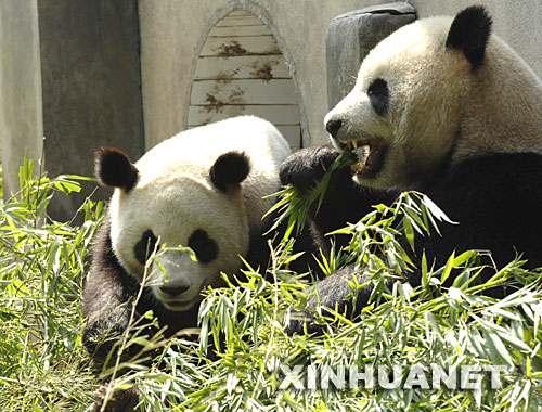 面對客人,憨態(tài)可掬的“團(tuán)團(tuán)”和“圓圓”一點(diǎn)也不認(rèn)生,它們并肩席地而坐,捧著美味的竹子大快朵頤。