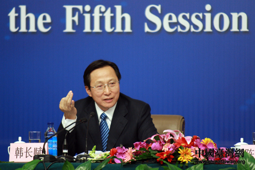 十一屆全國人大五次會議舉行記者會,農業(yè)部部長韓長賦回答中外記者的提問。(中國臺灣網 王偉 攝)
