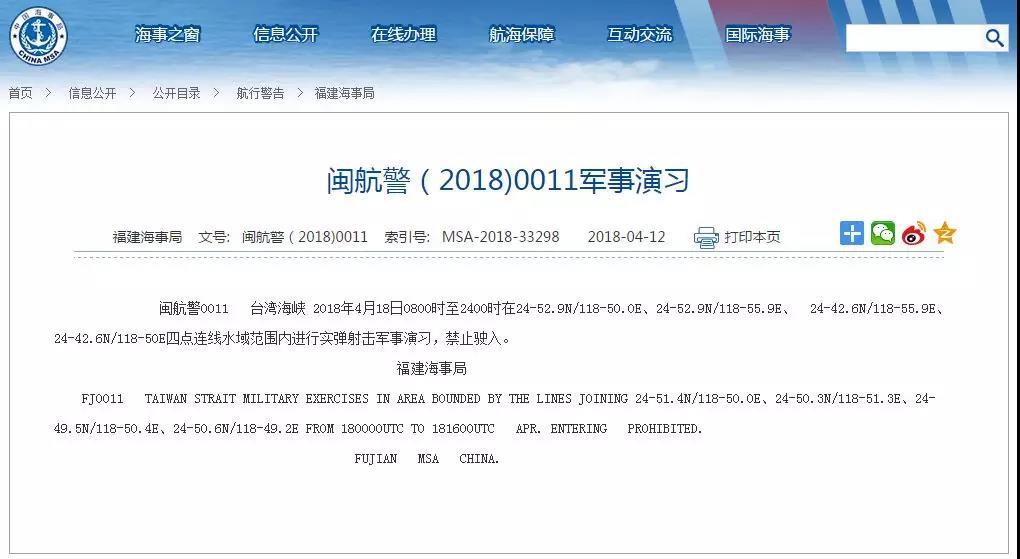 中國福建海事局消息,解放軍將于18日在臺灣海峽進行實彈射擊軍事演習(xí)。(福建海事局網(wǎng)站)