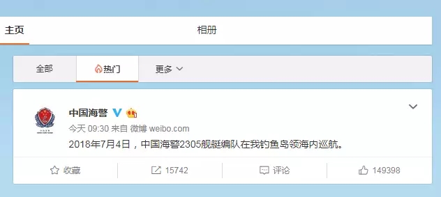 4日,中國海警局官方微博發(fā)出第一條微博,宣布2018年7月4日,中國海警2305艦艇編隊在我釣魚島領(lǐng)海內(nèi)巡航。(@中國海警)